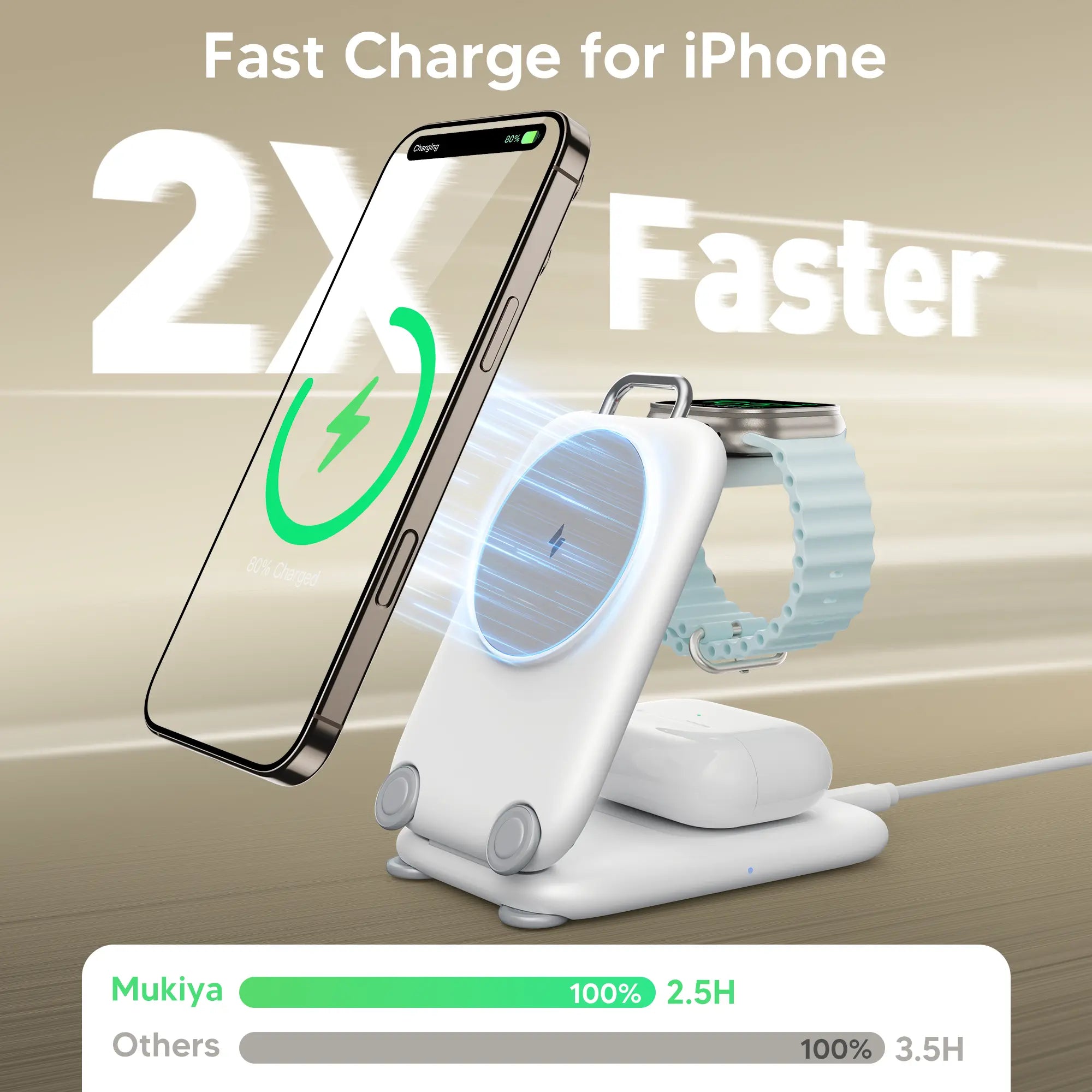 Supports simultaneous charging for iPhone and Apple Watch with magnetic alignment for secure connection.