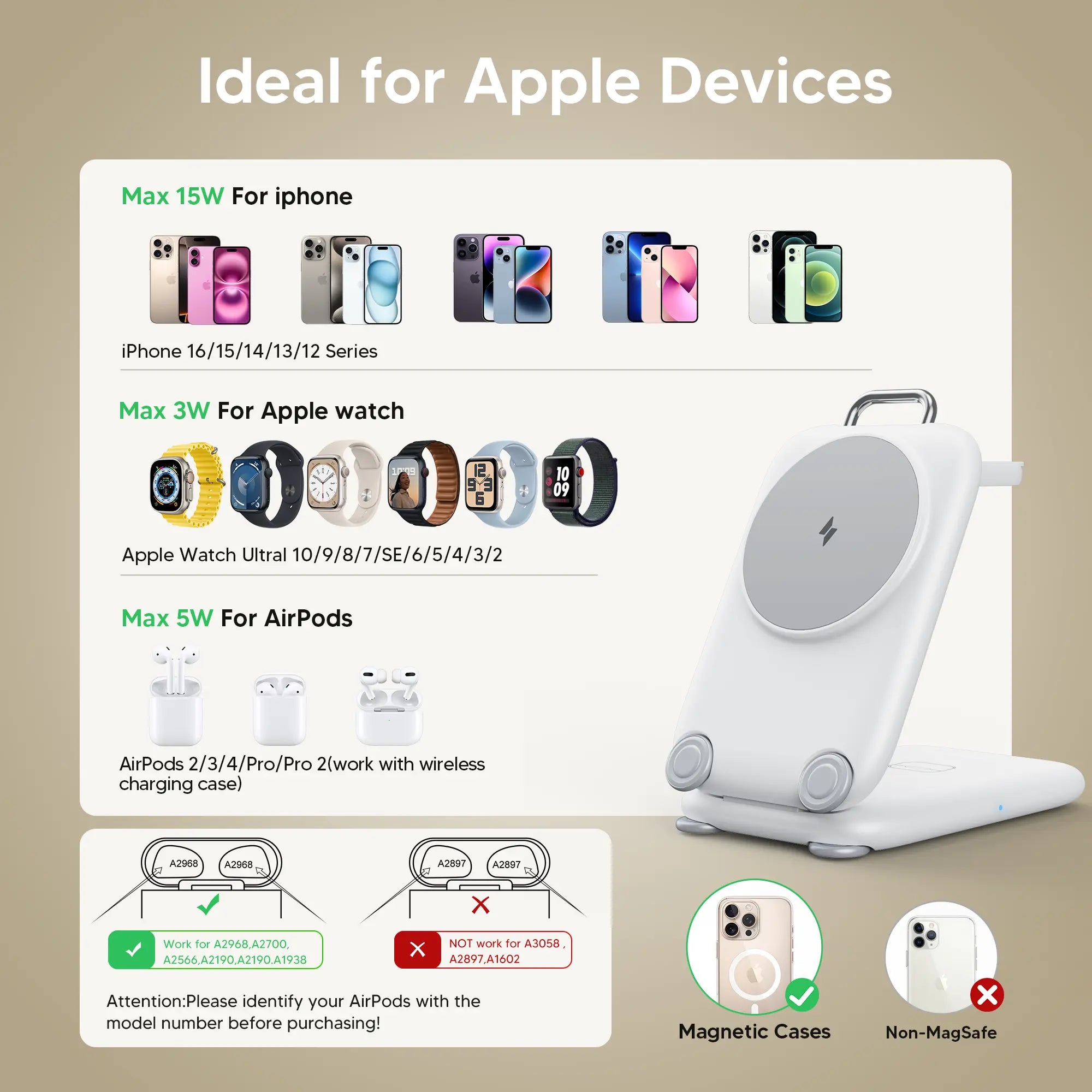 Supports iPhone 16/15/14/13/12 series with a maximum 15W wireless charging speed.