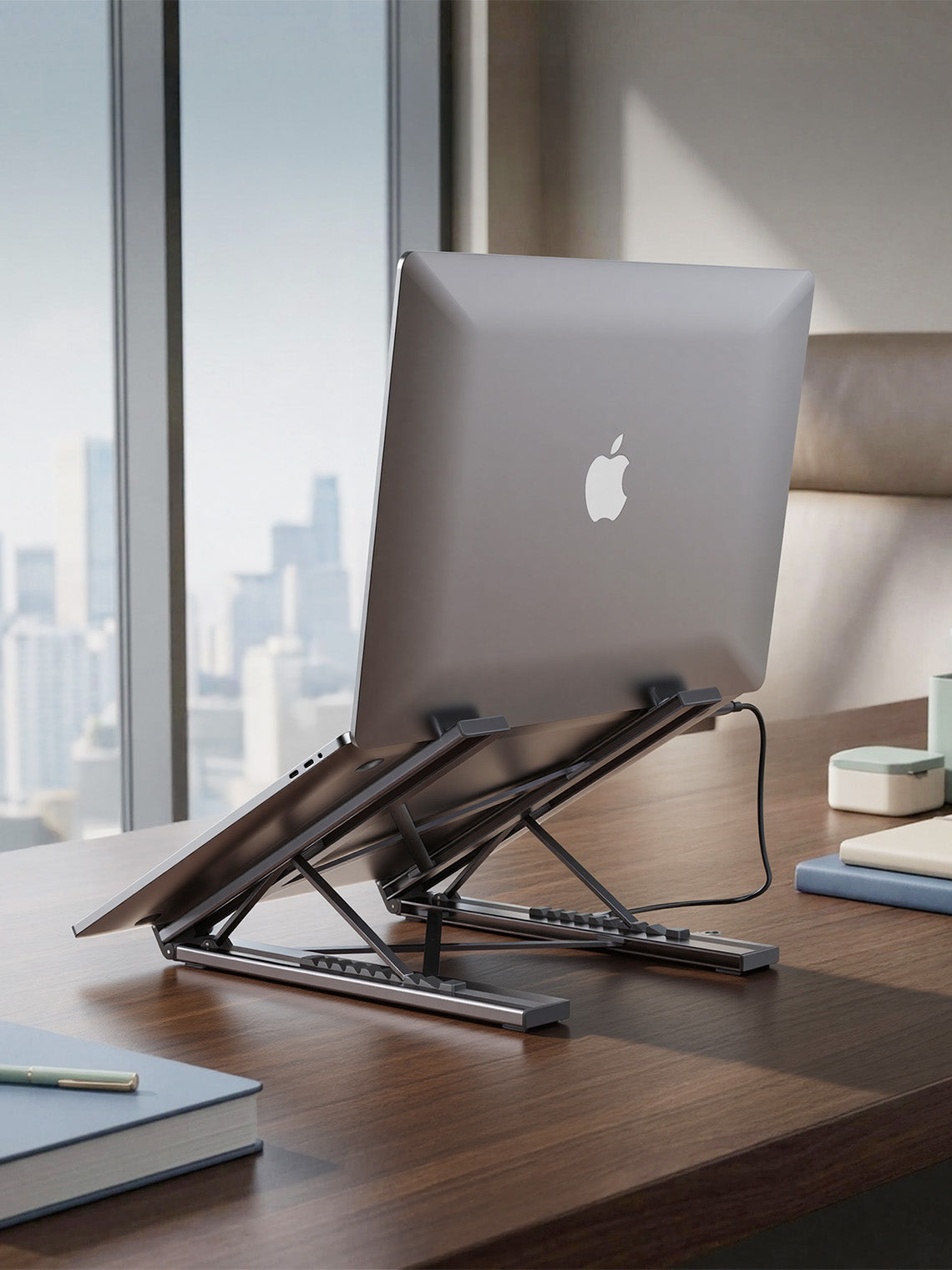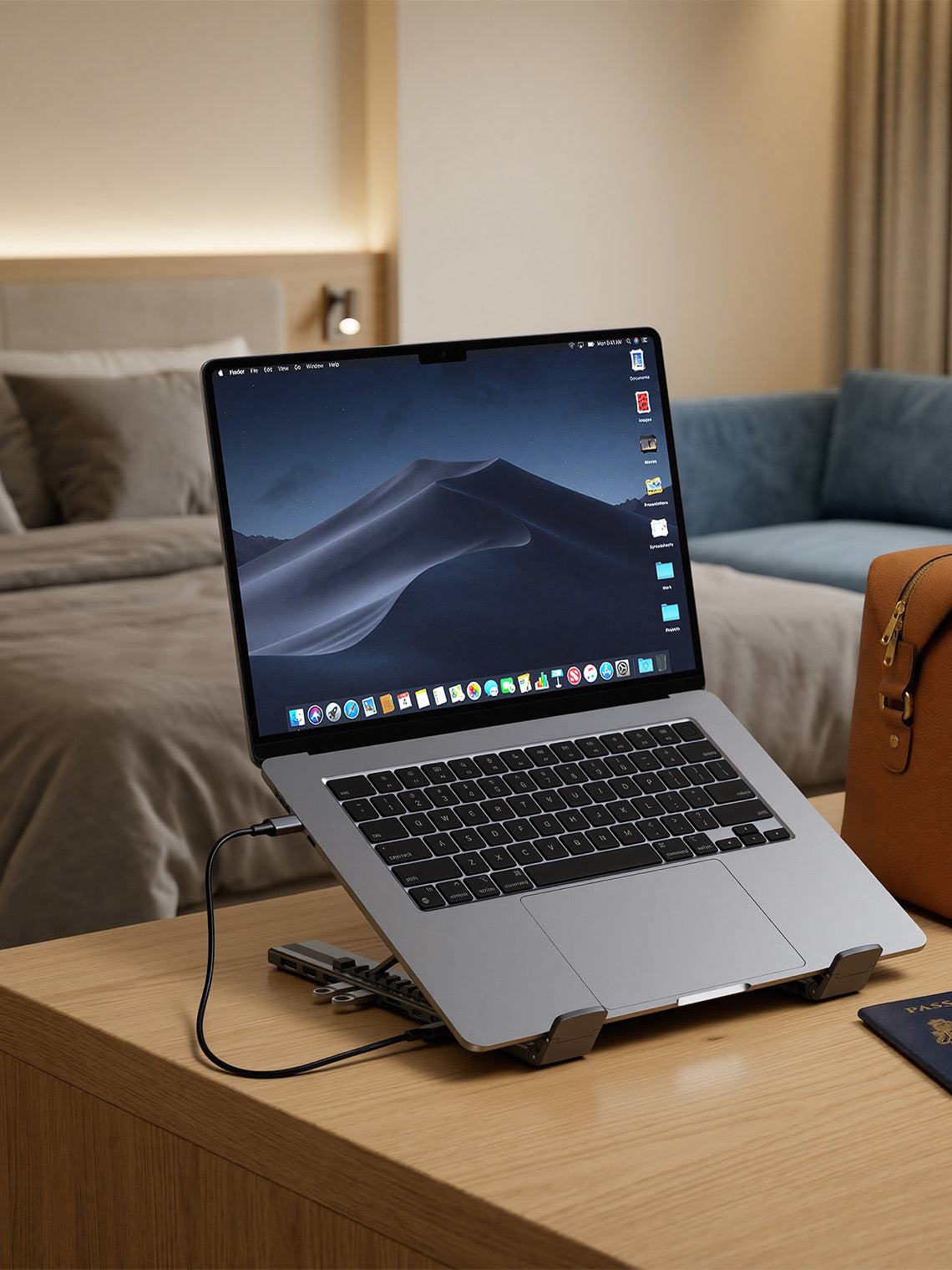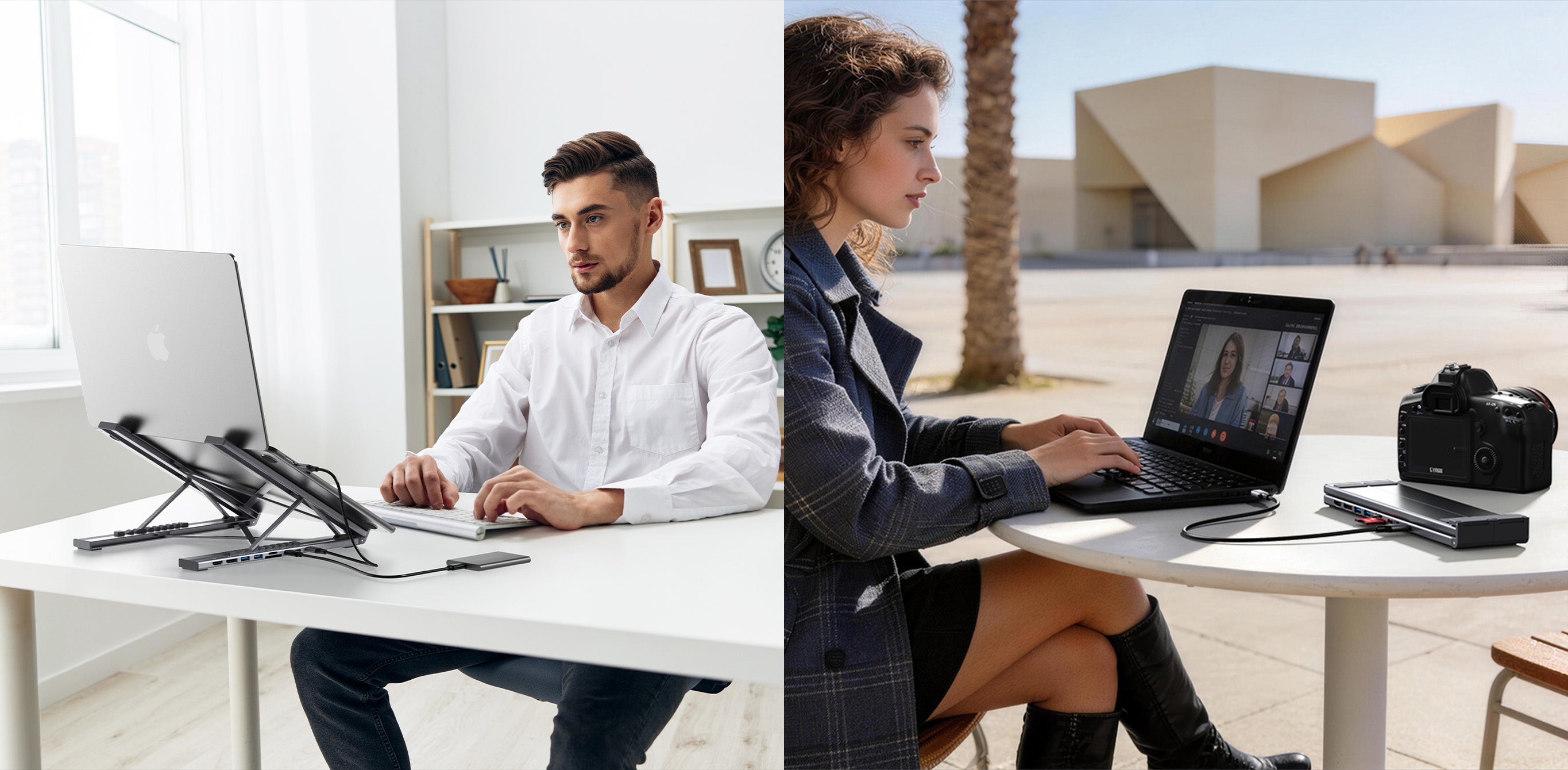 The same Laptop Dock Stand replaces both a stand and a hub, so you can work properly wherever you open your laptop.