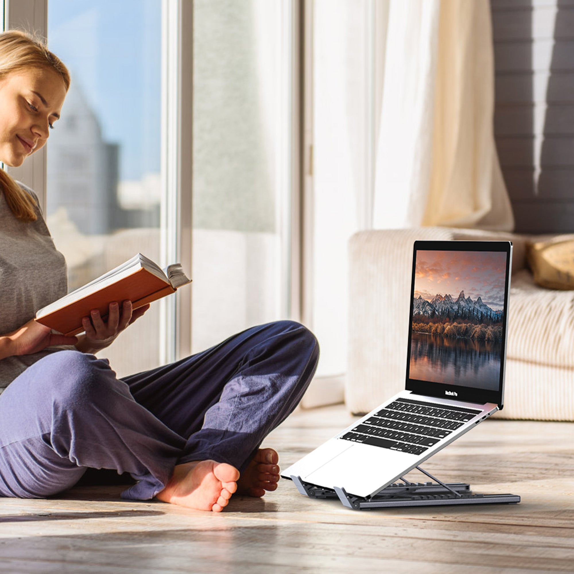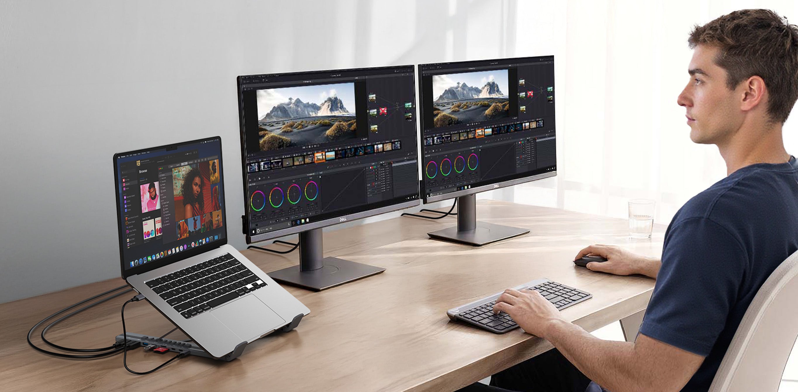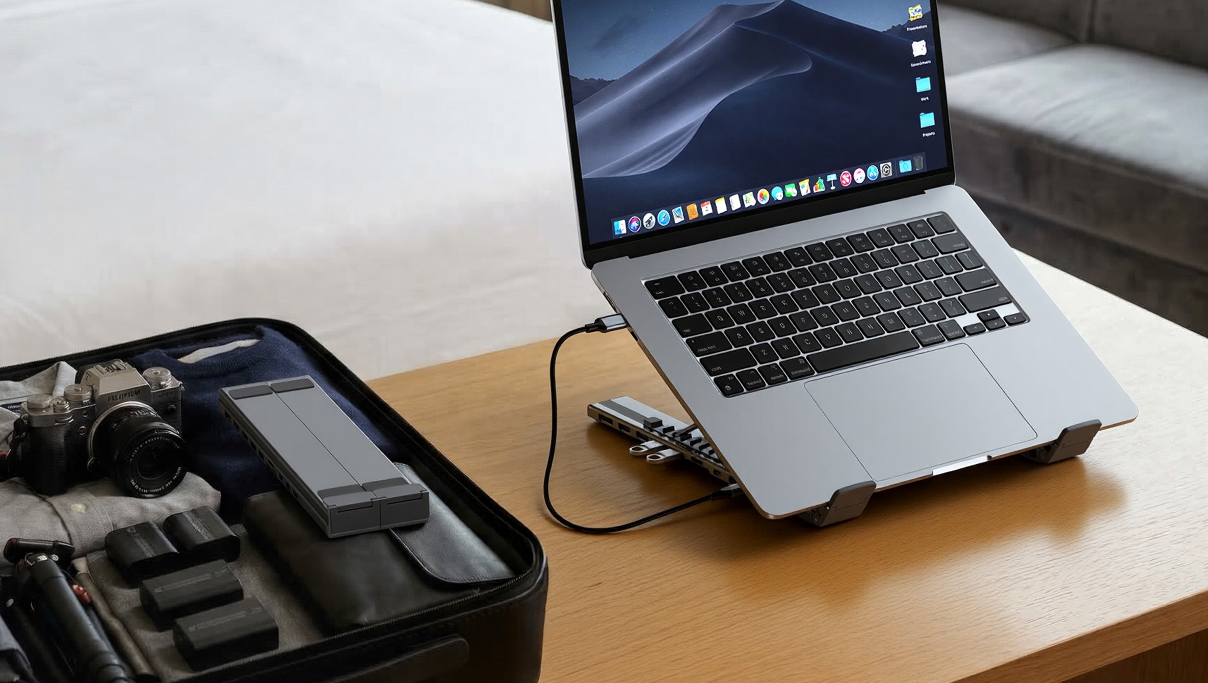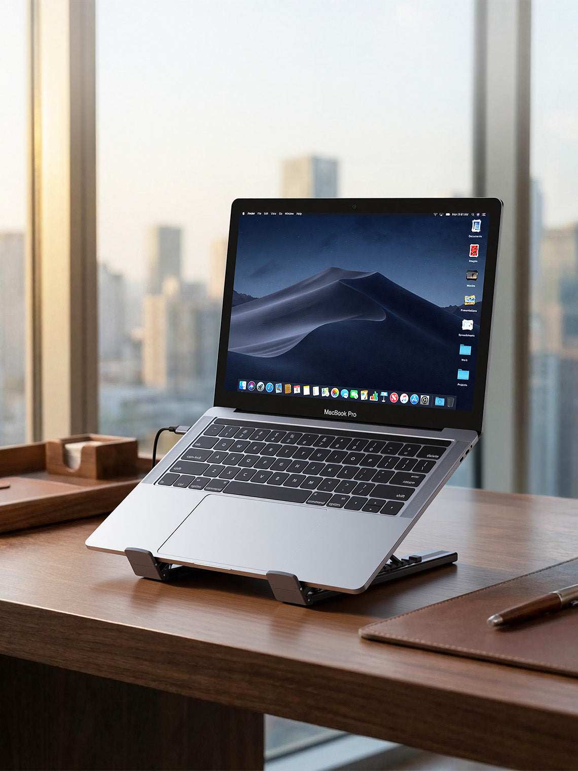 The same Laptop Dock Stand replaces both a stand and a hub, so you can work properly wherever you open your laptop.